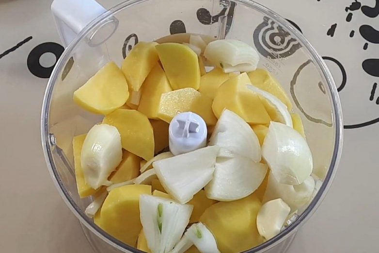 Пропусти картофель с луком через мясорубку или измельчи в блендере.