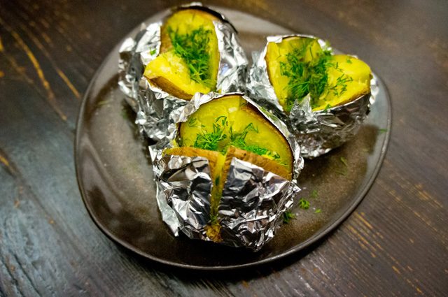 Картофелины помыть, завернуть в фольгу. Уложить на разогретые угли. Сверху мангала можно тем временем жарить курицу или купаты (мясо лучше не жарить, так как картофель несколько снижает температуру). Печь 10 минут, после чего перевернуть и еще 5-7 минут — с другой стороны. Извлечь из углей, дать немного фольге остыть, развернуть, есть с солью и маслом.