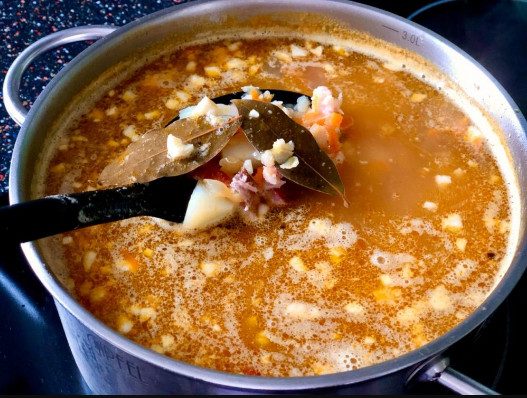 Добавляем в бульон лавровый лист и перец горошком. Добавляем зажарку в суп.