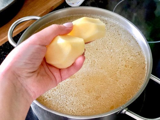 Очищаем картофель. У меня картофель маленького размера. 3 картофелины нарезаем на кубики, две оставляем целыми. Кладём картофель в бульон к гороху. Целые картофелины.