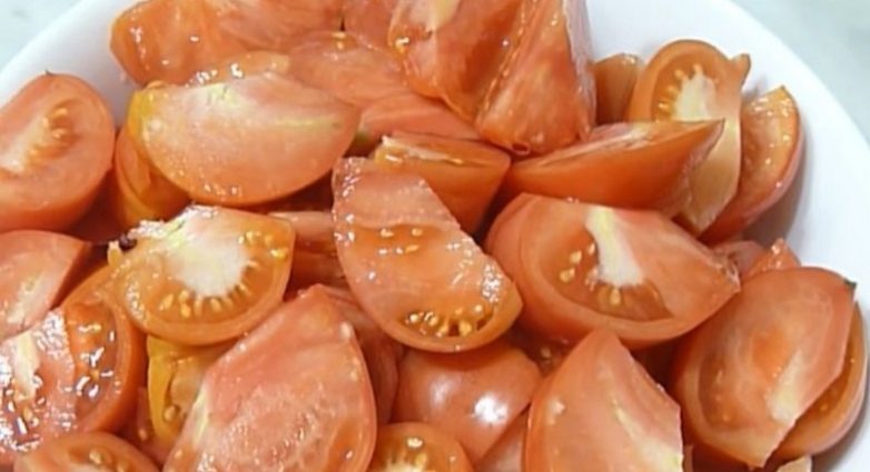 Лук и яблоки вымой и очисти. Помидоры просто вымой. Порежь каждый из этих ингредиентов на 4 части. Переложи всё в кастрюлю с толстым дном и вари около 2 часов при открытой крышке.