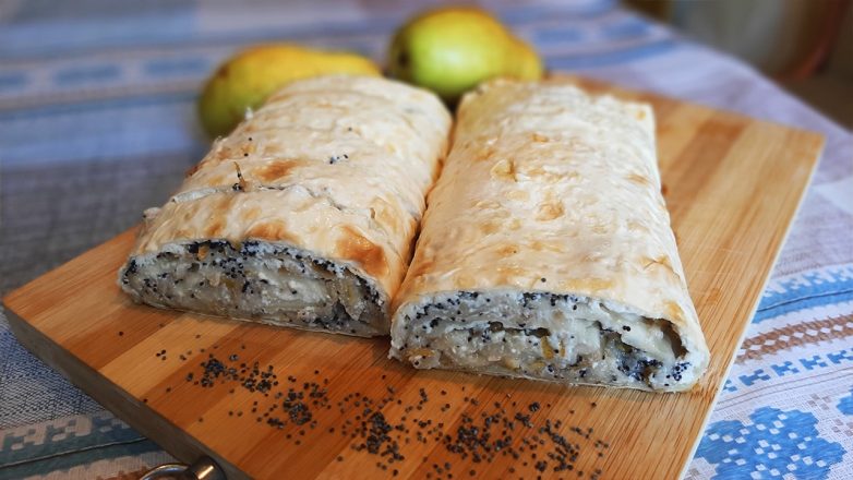 Рулет из лаваша с творогом, грушами и маком