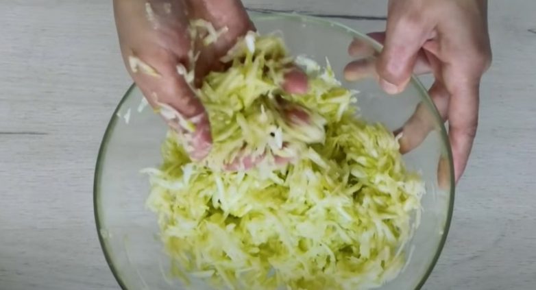 Кабачок вымой, очисти и натри на крупной терке. Слегка промни тертый кабачок руками, а затем слей с него сок.