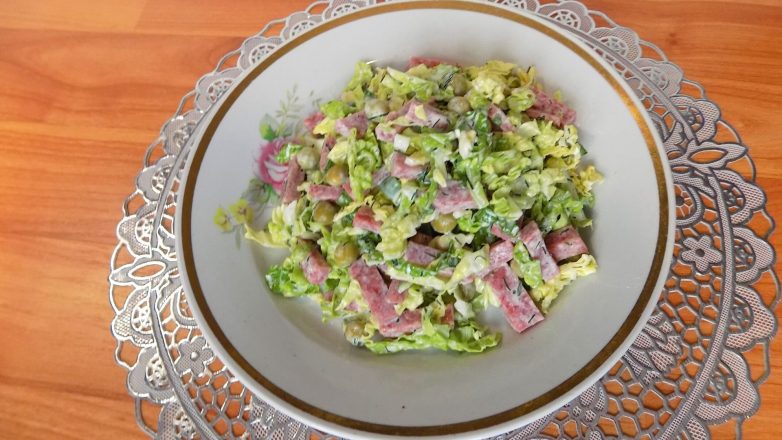 5. Все хорошо перемешиваем и наш быстрый салатик из савойской капусты с колбасой готов. Приятного Вам аппетита.