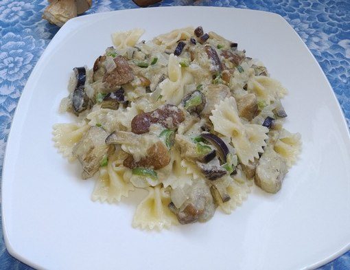 Блюдо осени: паста «Farfalle» с лесными грибами, баклажанами и острым зеленым перцем