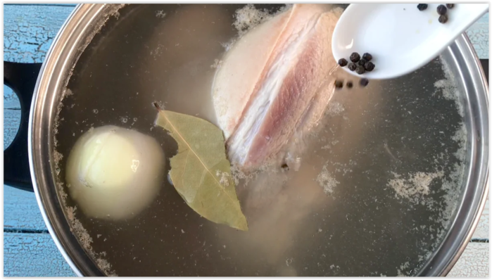 Очистила лук и морковь, опустила в бульон, добавила перец горошком, лавровый лист и соль, накрыла крышкой и варила на слабом огне 2 часа.