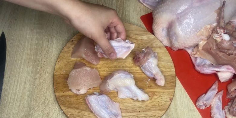 Первым делом следует разделать куриную тушку на порционные части и отделить мясо от костей. Затем берем кастрюлю и помещаем в нее все кости, нижние части крылышек и ножек, а также куриную спинку. После чего заливаем всё водой и ставим вариться на медленном огне.