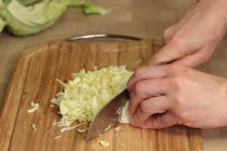 Мелко нарежь лук. Натри на крупной терке морковь.Нашинкуй капусту. Если у тебя квашеная капуста и она нарезана слишком крупно, ее тоже не помешает измельчить.