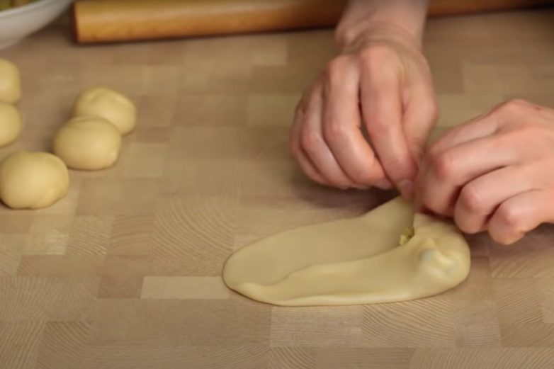 Раздели тесто на 15–16 равных частей.Раскатай каждый кусочек в тонкий овал.Выложи ложку начинки, накрой ее тестом сверху и сбоку. Скатай конвертик. Повтори эту процедуру со всеми кусочками теста.