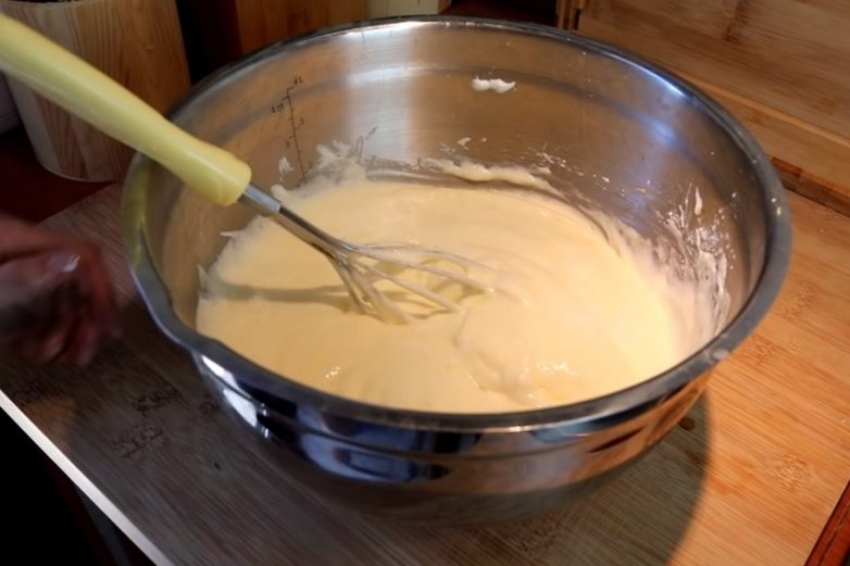 Добавь пену в миску с йогуртом и желтками.Аккуратно вымешай тесто венчиком.