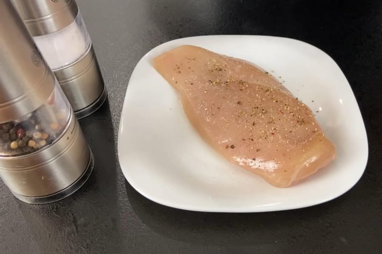 Первым делом промой куриное филе и просуши его на бумажных полотенцах. Затем натри мясо специями и солью по вкусу и оставь мариноваться в течение 30 минут.
