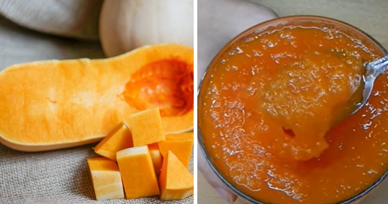 Отвари или запеки кусочки тыквы, чтобы тыква стала мягкой. Готовую тыкву перебей блендером до состояния пюре.