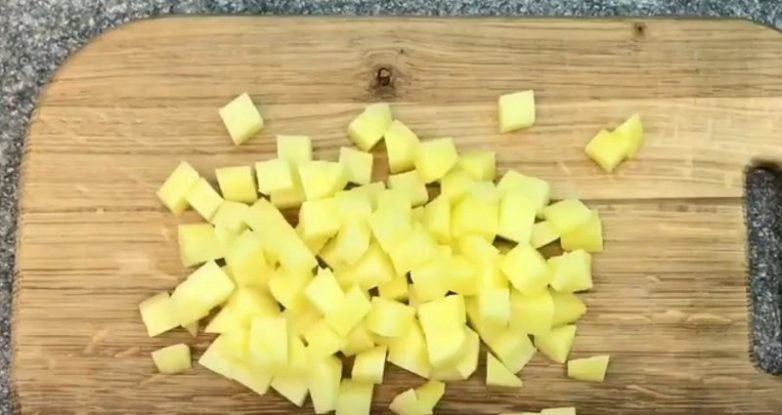 Налей в кастрюлю воду и поставь на огонь. Затем вымой и начисти картофель. Нарежь картофель небольшими кусочками, а затем всыпь их в кипящую воду. Вари около 10 минут.