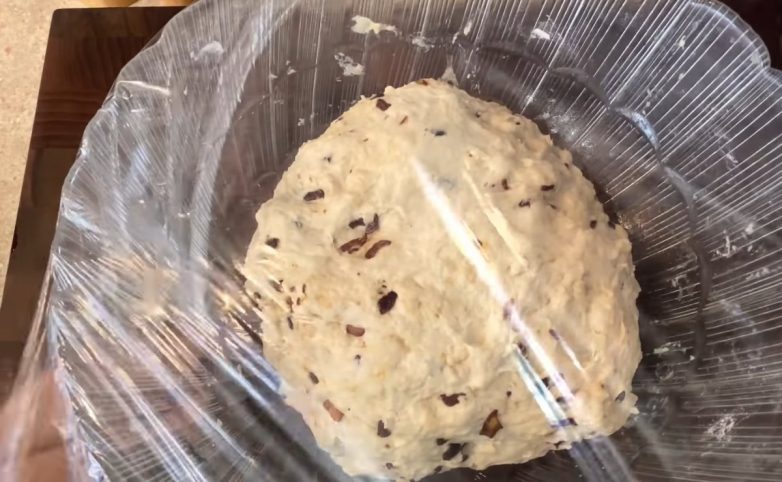 После тесто нужно накрыть пищевой пленкой и кухонным полотенцем, а затем отправить в теплое место на 45–60 минут, чтобы оно хорошенько поднялось. По истечении этого времени достаем тесто, обминаем и укладываем в форму для выпечки.Если форма силиконовая, можно сразу выкладывать тесто в нее, если же металлическая, то для начала обязательно смажь ее растительным маслом и слегка присыпь мукой.