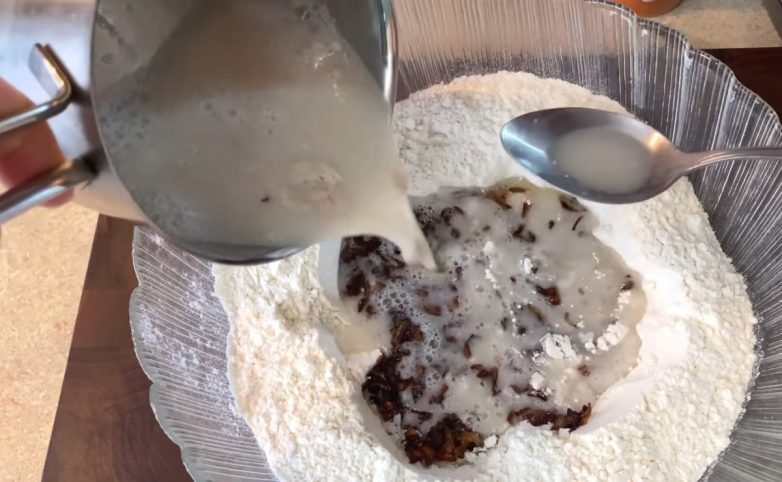 Затем берем большую глубокую миску и соединяем в ней муку с разведенными дрожжами и луком. Замешиваем тесто до момента, пока оно не станет однородным и липким.