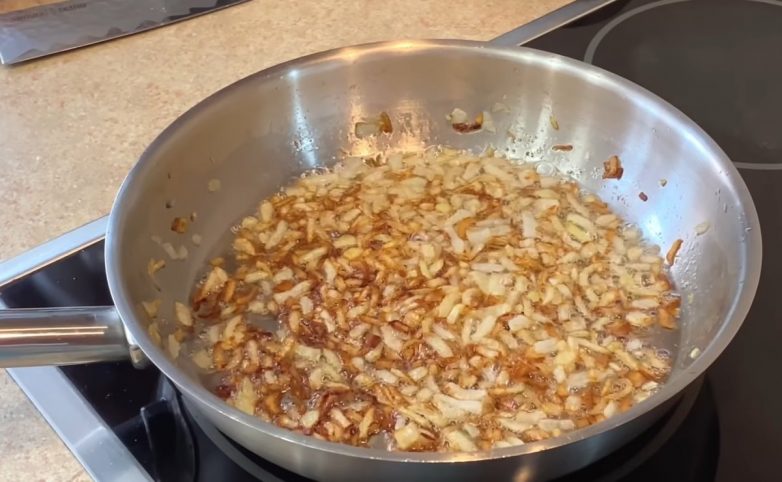 Далее необходимо очистить лук от шелухи и нарезать его мелкими кубиками, а затем обжарить на растительном масле. Обжарить лук необходимо до состояния чипсов, чтобы он был хрустящим, но не подгорел. Поэтому во время обжарки его следует постоянно помешивать, а сразу по готовности пересыпать в небольшую тарелочку, чтобы он не подгорел, оставаясь на еще горячей сковородке.
