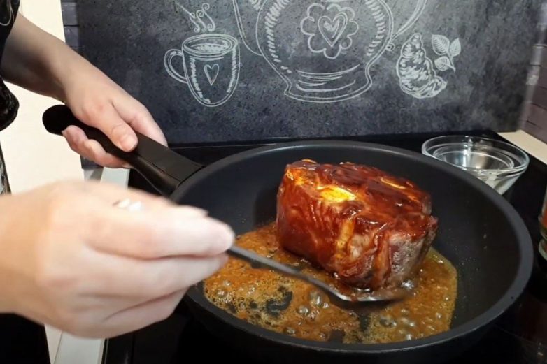 Получившимся соусом нужно тщательно смазать нашу вырезку, а остатки вылить рядом.