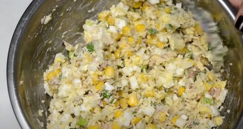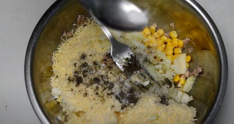 В удобной емкости разомни печень трески вилкой. Добавь зелень, кукурузу, измельченное яйцо, мелко порезанный лук и сыр. Посоли, поперчи по вкусу. Хорошенько перемешай.