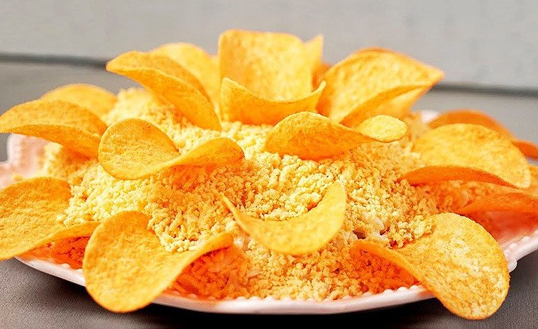 Возьмите чипсы и аккуратно вставьте их в салат, формируя цветочек.
