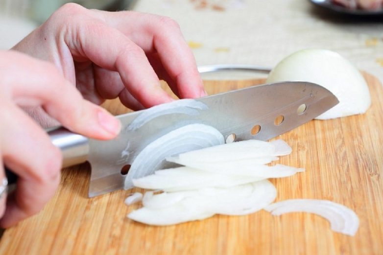 Сперва замаринуй лук, чтобы он не давал слишком насыщенный вкус и запах. Для этого порежь его тонкими полукольцами, залей уксусом, добавь по 1 ст. л. соли и сахара, залей кипятком. Мариноваться лук должен около 15 минут.