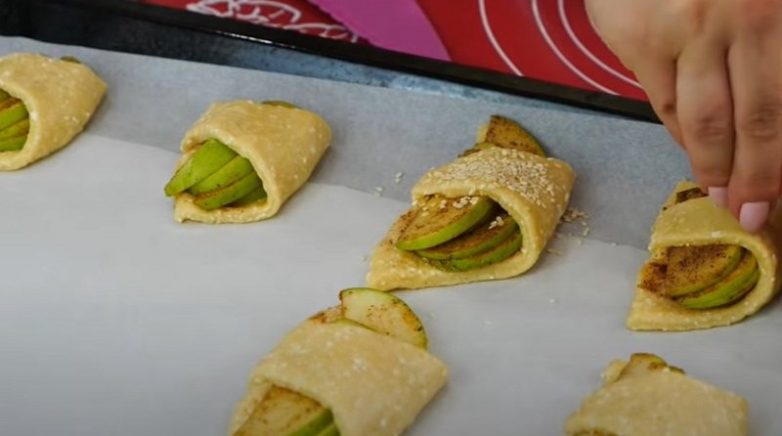 Противень застели пергаментом. Тесто достань из холодильника и хорошо перемешай руками в течение 5 минут. Обрати внимание, что тесто не должно липнуть к рукам.Раздели тесто на 2 части. Каждый кусочек теста нужно раскатать так, чтобы диаметр был приблизительно 25 сантиметров. Раздели тесто ножом на 8 равномерных частей. На широкий край конвертика выкладывай по 3–4 дольки яблока. Подними свободный край теста и оберни им конвертик так, чтоб краешек подвернулся под низ. Перекладывай конвертики на противень. Из одной порции выходит около 16 таких конвертиков.