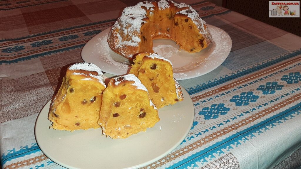 Изюм зальем кипятком и оставим на 10 минут. Яйца с сахаром взбиваем до пышности в течение 5 минут. В яично-сахарную массу добавляем тыквенное пюре и растительное масло и все еще раз хорошо перемешиваем. В массу просеиваем муку с разрыхлителем и замешиваем тесто. Изюм обсушиваем, обваливаем в муке и равномерно распределяем по всему тесту. Берем форму (я использовала силиконовую), выкладываем в нее тесто и отправляем в предварительно разогретую до 180 градусов духовку на 35 – 40 минут. Готовому кексу даем остыть в форме, извлекаем из нее и сверху посыпаем сахарной пудрой. Тыквенный кекс с изюмом готов! Более подробный рецепт приготовления смотрите на видео. Приятного аппетита!