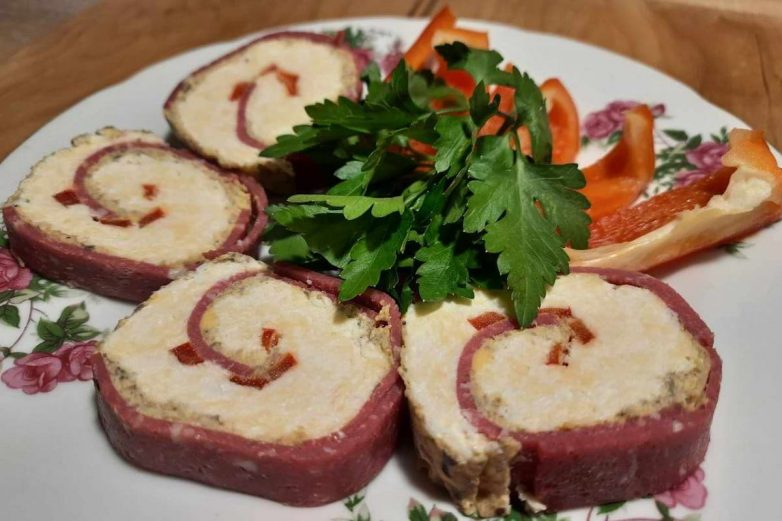 Отправь рулет на ночь в холодильник. Мне было было невмоготу ждать, и я использовал морозилку (хватило 1 часа).Сними бумагу и нарежь закуску порционными кусочками.