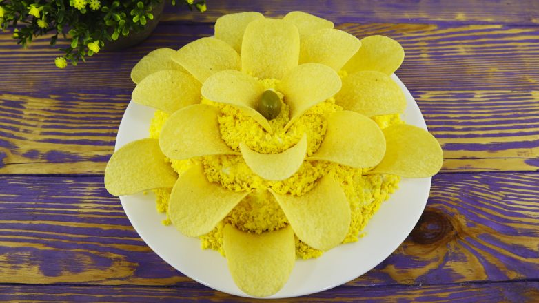 6. Берем одинаковой формы чипсы, вставляем их в салат, формируя цветочек. По желанию в середину салата, можно положить оливку или маслину. Красивый и вкусный салат готов. Приятного аппетита!