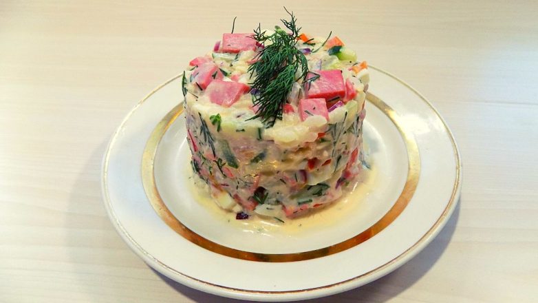 Салат на праздничный стол с рисом, яйцами и колбасой