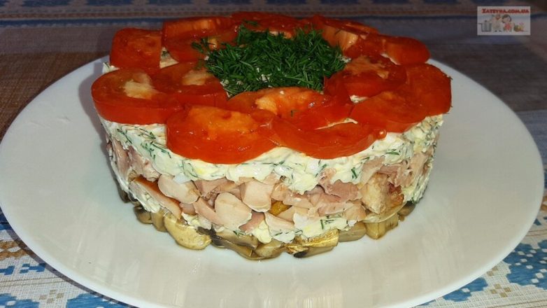 Яйца отварить в воде 7-10 минут и остудить в холодной воде. Для того, чтобы плавленые сырки хорошо потерлись, отправим их в морозилку на полчаса. Грибы порежем средними кусочками, раскалим сковороду на среднем огне и обжарим грибы до готовности в собственном соку в течении 7-10 минут. Курицу разберем и порежем мелким кубиком. Сыр и яйца потрем на крупной терке, чеснок на мелкой терке, зелень мелко порубим. Все вместе посолим, поперчим, заправим майонезом и перемешаем до однородного состояния. На блюдо ставим сервировочное кольцо (диаметр моего кольца 16 см) и формируем салат. Первый слой – грибной, второй – половина сырно-яичной массы. Третий слой – курица, четвертый – вторая половина сырно-яичной массы. Хорошо разравниваем верхний слой и отправляем в холодильник на 1 час пропитаться и настояться. Снимаем кольцо, помидоры режем кольцами или полукольцами и выкладываем последним слоем на салат, можно по желанию добавить зелень. Слоеный салат «Любимый муж» готов! Более подробный процесс приготовления салата смотрите на видео. Приятного аппетита!