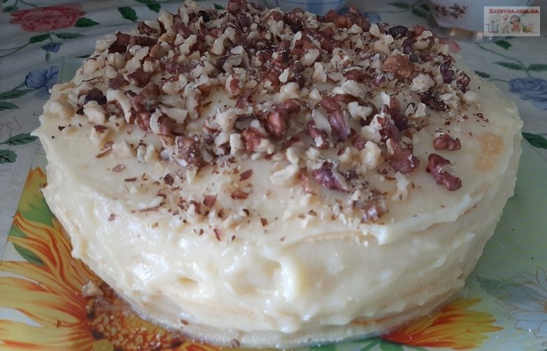 Так как коржи готовятся очень быстро, займемся приготовлением заварного крема. В кастрюлю вливаем молоко, добавляем в него 2 яйца, 2 стол. ложки муки, стакан сахара и пакетик ванильного сахара, хорошо взбить венчиком и ставим на медленный огонь. Варим, помешивая, до загустения, крем густеет очень быстро, я варю крем обычно 2-3 минуты. В горячий крем добавляем сливочное масло, хорошо перемешиваем и накрываем крышкой, чтоб крем не остыл. Теперь приступаем к коржам. В миску выливаем банку сгущёнки, добавляем яйцо и хорошо перемешиваем. Затем добавляем разрыхлитель и постепенно подсыпаем муку. Когда ложкой мешать станет трудно, тесто перекладываем на рабочую поверхность и домешиваем не забивая, тесто должно быть мягкое и эластичное. Делим тесто на 8 равных частей. Раскатываем каждую в корж, прикладываем тарелку и вырезаем по контуру ножом, чтобы коржи были ровные и одинаковые. Разогреваем сковороду на среднем огне и начинаем печь. Коржи пекутся очень быстро — буквально 1 минуту — и сразу переворачиваем. Таким образом печём все 8 коржей. Начинаем смазывать коржи кремом. Крем за это время не успевает остыть, коржи пекутся очень быстро и крем еще теплый, поэтому тортик быстро и хорошо пропитывается. Затем верх торта и бока тоже хорошо смазываем. Украшаем по желанию – кокосовой стружкой, шоколадом, сухофруктами – чем хотите, я украсила измельченными грецкими орехами, мне их понадобилось 10 штук. Тортику даем постоять пропитаться в течении часа и можно кушать. Торт на сковороде с заварным кремом готов! Более подробный рецепт приготовления смотрите на видео. Приятного аппетита!