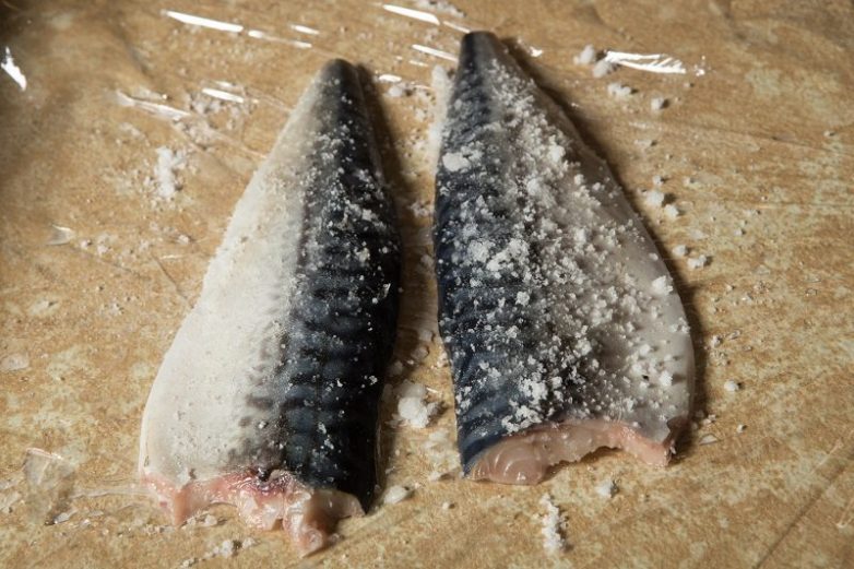 Выпотроши рыбу, промой ее и нарежь кусочками.Затем выложи рыбу на пищевую пленку, обмакивая ее в смесь для соления с двух сторон.