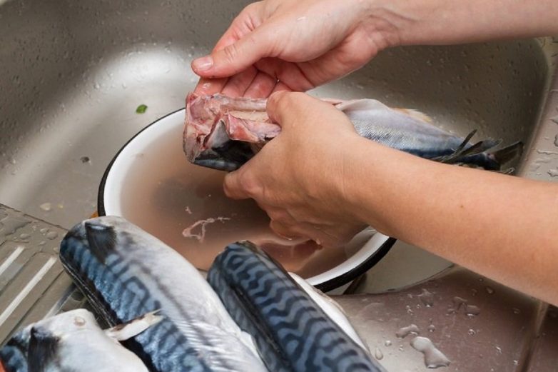 Скумбрию нужно разделать и выпотрошить. Головы и хвосты складывай отдельно, они будут использованы. Убери все пленки, чтобы осталось только мясо. Промой тушки под водой и нарежь дольками, как если бы они готовились для жестяной банки.