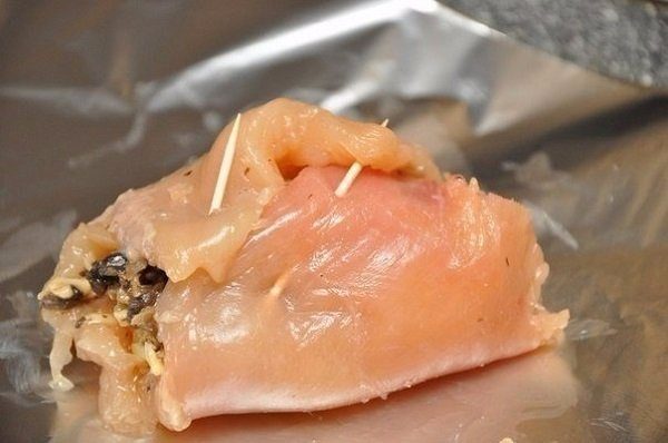 Отбей куриное филе, посоли, поперчи и выложи в центр каждого кусочка грибной фарш.