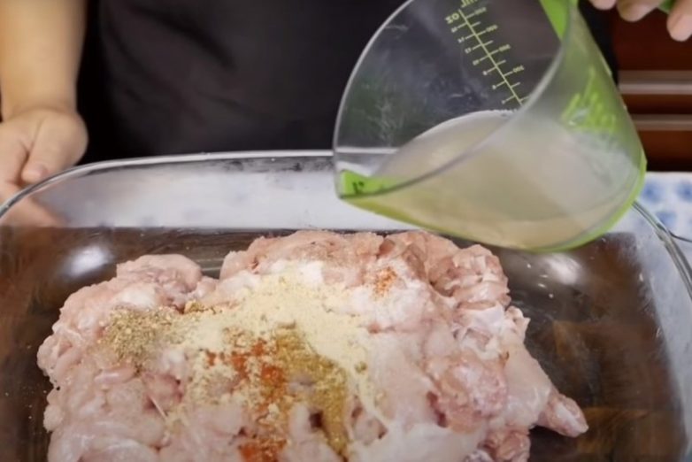 Куриные кости отправь в кастрюлю, залей водой и свари куриный бульон. Он готовится 30–45 минут. Туда можно добавить лавровый лист и перец горошком для аромата.Нарежь куриное мясо маленькими кусочками толщиной 0,5–1 см. Затем нарезанное мясо слегка отбей плоской стороной ножа.