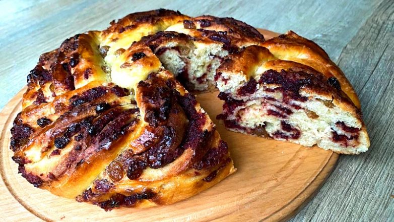 Раскатать тесто в пласт размером примерно 50/60 см. Распределить начинку и посыпать промытым, просушенным изюмом. Свернуть в рулет. Разрезать его отступив от края 3-4 см. Переплести края рулета, срезом вверх. Свернуть по кругу в «улитку». Уложить в форму для выпечки, смазать взболтанным яичным желтком с молоком, сверху уложить кусочки сливочного масла.
