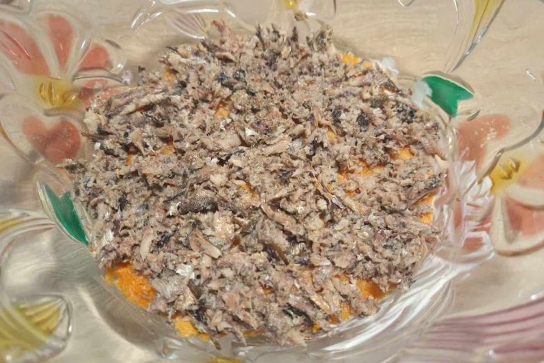 Разомни оставшиеся шпроты вилкой и выложи их третьим слоем. Снова смажь майонезом.