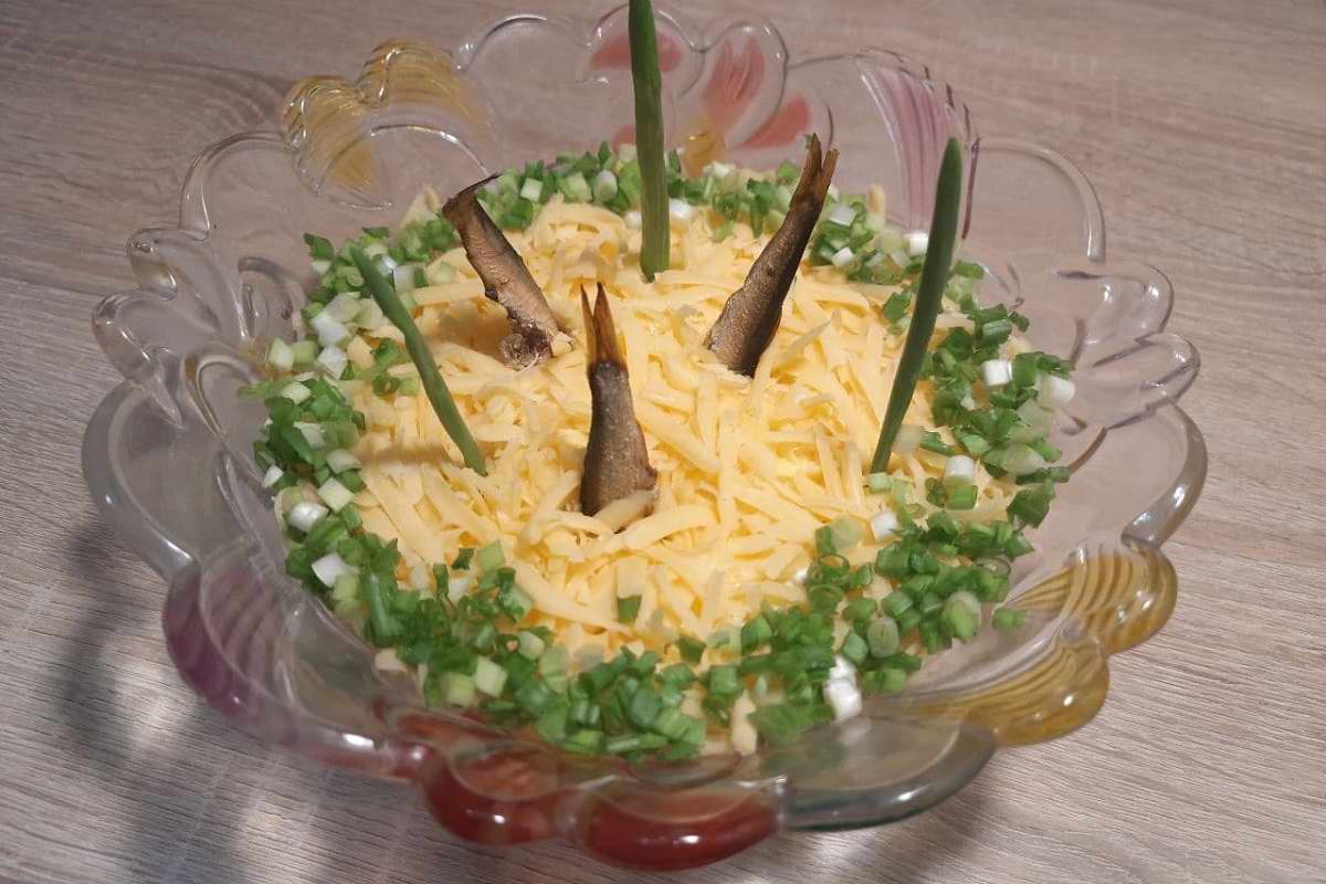 Посыпь тертым сыром салат.Тщательно вымой перья лука. Оставь 2–3 красивых ровных пера, а остальное мелко нарежь.Осталась самая ответственная и творческая часть рецепта: украсить салат.Посыпь салат по краю салатника нарезанным луком.Воткни отобранные шпротинки и перья лука в салат так, чтобы они держались вертикально.