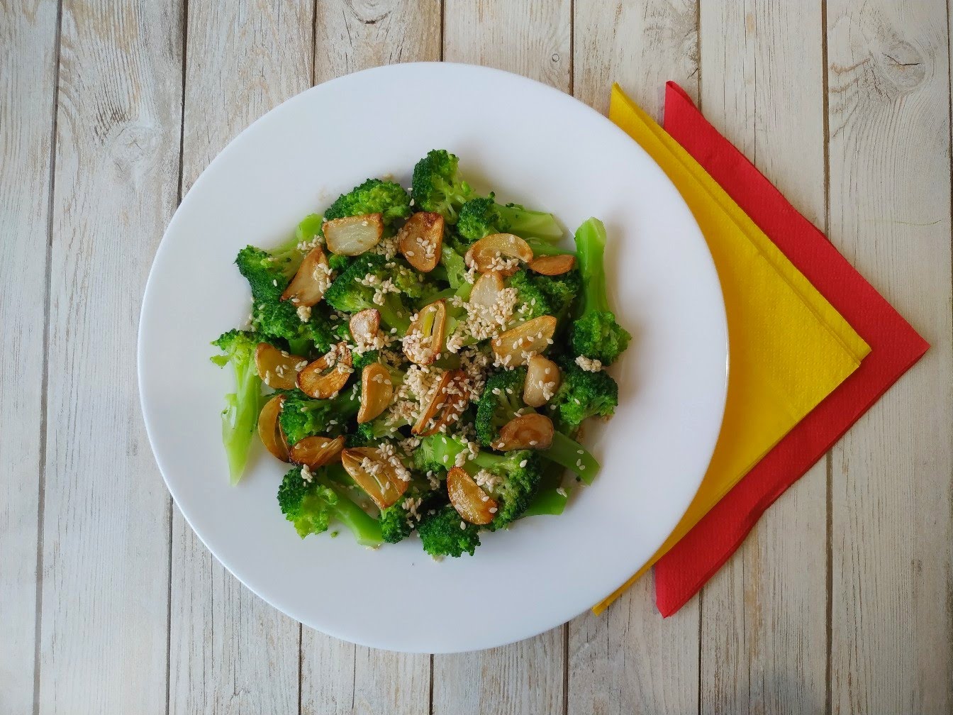 5. Брокколи разбираем на соцветия, выкладываем сверху чесночные чипсы, поливаем заправкой и посыпаем кунжутом.