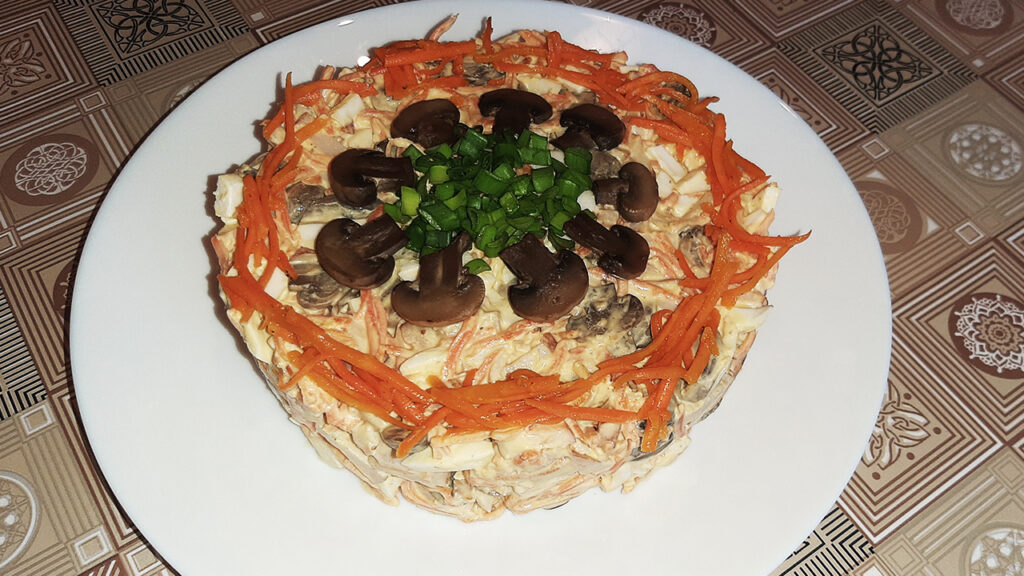 Вкусный и простой салат с копченой курицей, грибами и морковью по-корейски, готовится не более 15 минут и всего из 4 ингредиентов. Получается очень вкусным и сочным, очень нравится гостям!