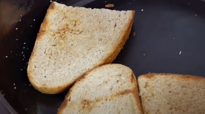 Слей со сковороды лишнее масло, убери бумажным полотенцем лишний жир. Затем хорошо смажь жиром сковороду, выложи на нее хлеб. Обжаривай хлеб с двух сторон.