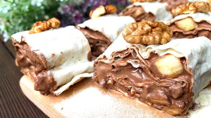 Сметану смешать с сахаром, ванильным сахаром, какао-порошком. Лист лаваша смазать сметанным кремом, посыпать сверху рублеными орехами и кусочками банана.