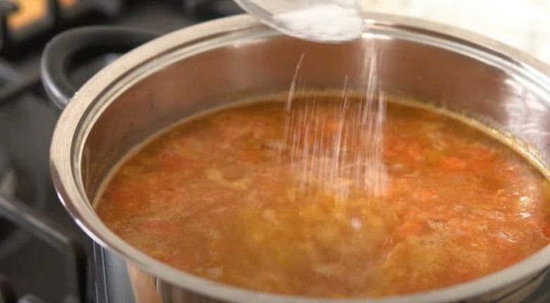 Кастрюлю, в которой будешь варить суп, поставь на средний огонь, влей туда растительное масло и добавь сливочное масло. Всыпь лук и слегка пассеруй его в течение 2 минут, затем добавь морковь, сельдерей, перец, чеснок.Также добавь щепотку соли и немного черного молотого перца. Обжаривай овощи в течение 2–3 минут, периодически помешивая.