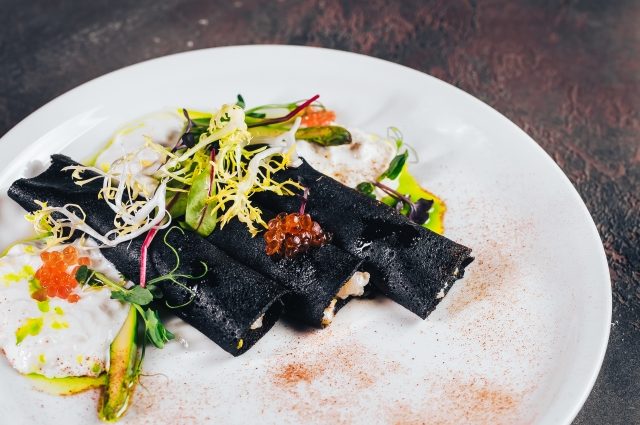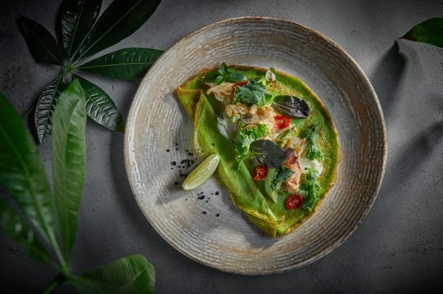 Шаг 6. Готовую начинку закладываем в готовые блины и сворачиваем их трубочкой, выкладываем на тарелку. Украшаем сыром страчателла, красной икрой, миксом салата, спаржей, зеленым маслом и копленой паприкой.