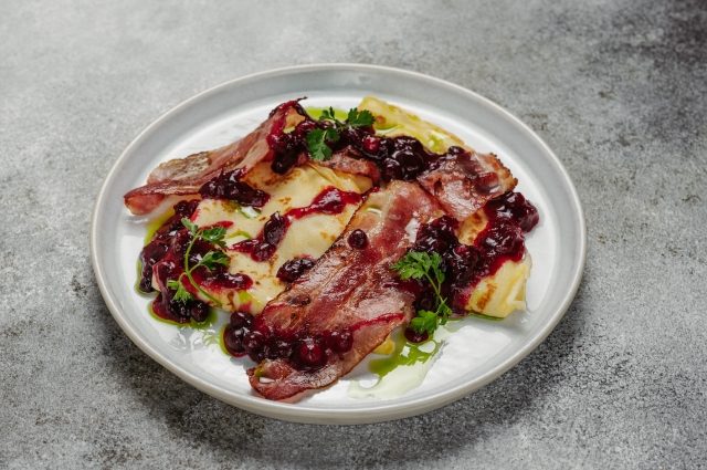 Шаг 5. Выложить блины на тарелку, украсить беконом и клюквенным соусом.