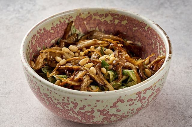 Тёплый салат с грибами, шпинатом и ореховым соусом