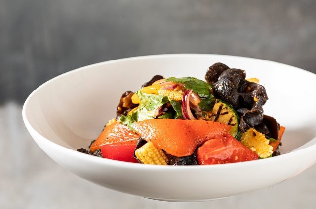 Шаг 3. На тарелку выложить пасту из маслин, сверху — овощи. Украсить древесными грибами.