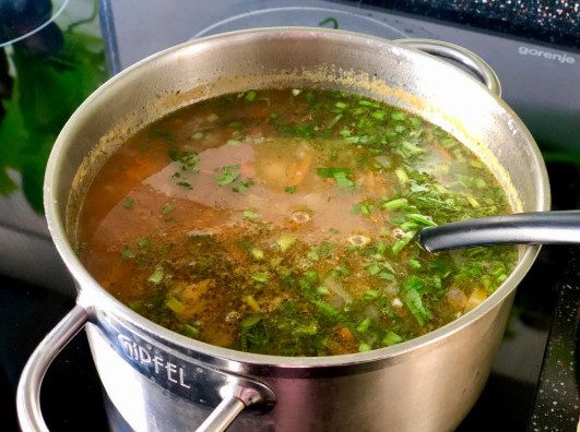 Ждём пока сварится картошка, убавляем огонь до среднего, кладём фасоль и варим 1-2 минуты. Суп выключаем.