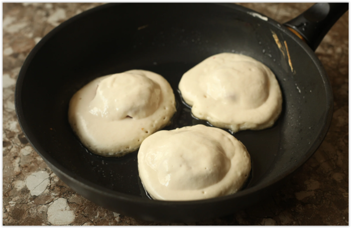 Теперь в сковороду наливаем приблизительно 3-4 столовые ложки растительного масла, разогреваем и начинаем выкладывать по 1-1,5 ст. л. теста в виде круглых лепешек, как оладьи. Сразу же в центр каждой лепешки кладем начинку, слегка вдавливая ее в тесто.