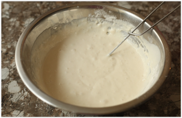 Яйцо смешиваем с солью в отдельной миске. И взбиваем вилкой (венчиком) до легкой пены. Взбитое яйцо вливаем в миску с кефиром и добавляем примерно 100 г муки с разрыхлителем. Перемешиваем и подсыпаем оставшуюся муку небольшими частями, чтобы не переборщить. Хорошо размешиваем тесто, оно должно быть без комочков. Консистенция – как на классические оладьи. Идеально, если получится не сильно густо, но при этом тесто не должно сильно расплываться на сковородке, то есть должно минимально держать форму.